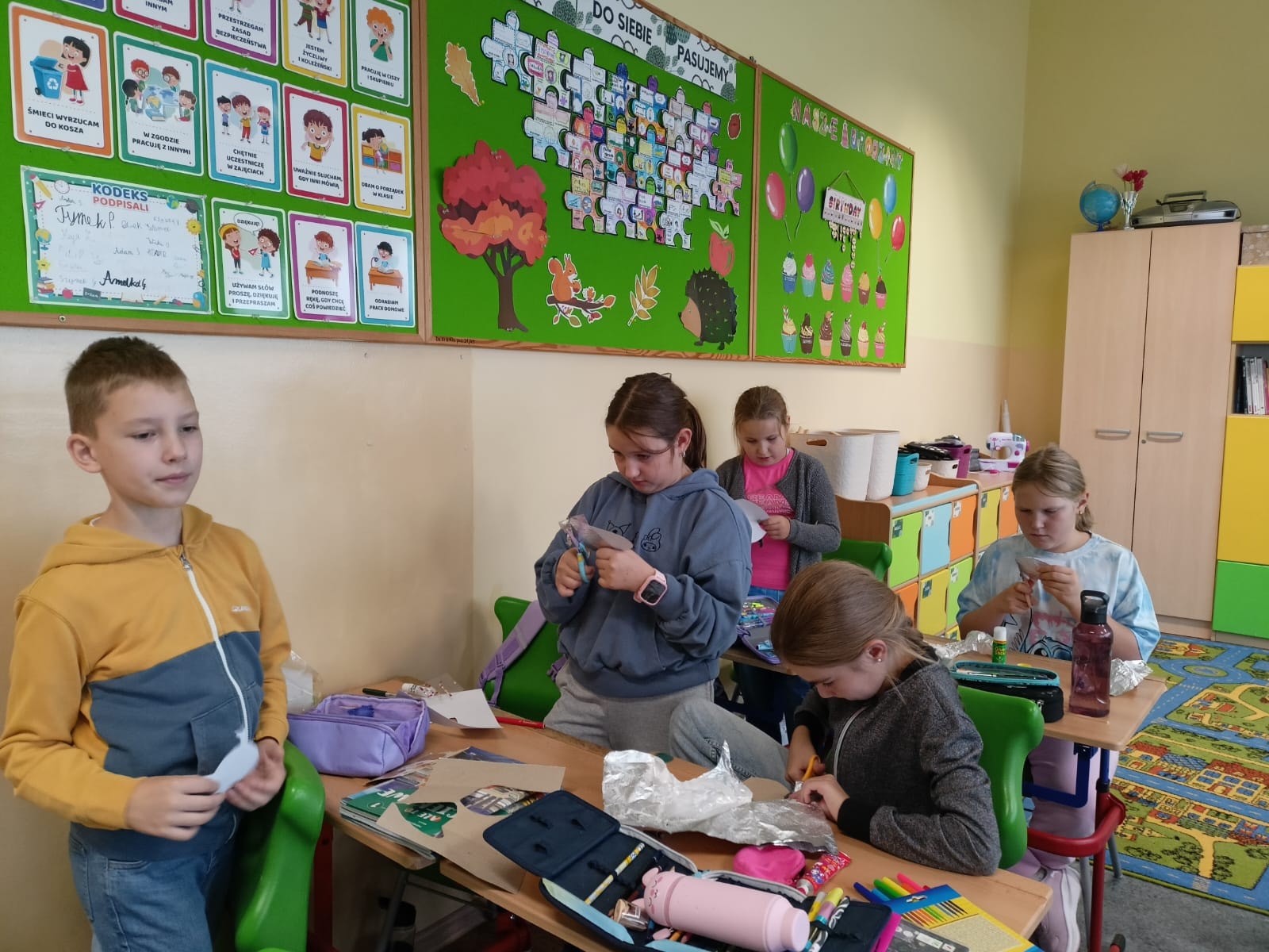19 września 2025 r. w naszej szkole odbyło się spotkanie uczniów klas Ia i Ib z policjantem Marcinem Krawcem. Celem spotkania było zapoznanie uczniów z zasadami bezpieczeństwa w szkole i poza nią. Policjant rozmawiał z dziećmi o podstawowych zasadach bezpieczeństwa w ruchu drogowym, podkreślił ważną rolę elementów odblaskowych, które każdy uczeń powinien posiadać. Przypomniał również zasady jakie należy stosować w kontaktach z obcymi oraz ważną rolę korzystania z fotelików, a także pasów bezpieczeństwa podczas podróży samochodem wraz z rodzicami Na zakończenie uczniowie zadawali pytania dotyczące bezpieczeństwa oraz dzielili się swoimi spostrzeżeniami. A Pan Policjant rozdał wszystkim uczniom zawieszki odblaskowe.
